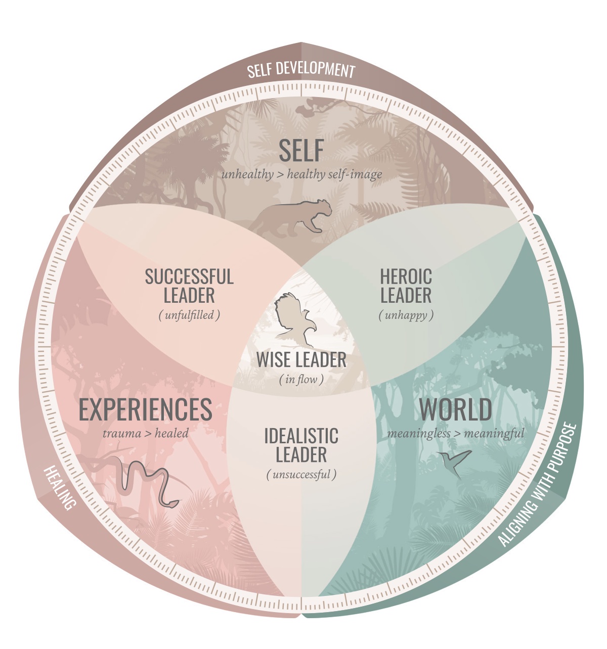When you master all three fields you’re a Wise Leader. You’ve embraced your past, you are fully aligned with your purpose and you have the mindset and skills to transform this into reality. You feel happy, fulfilled and in flow.